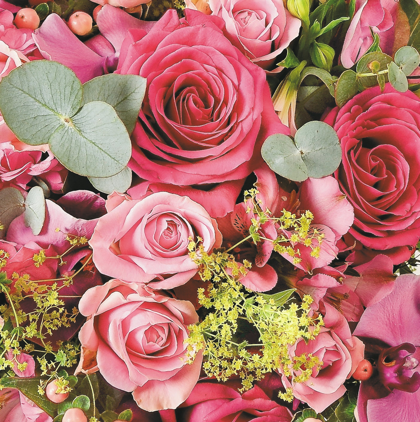 - Eucalyptus and fresh seasonal greens – providing contrast and a fragrant finish